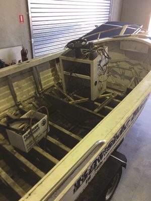 After several years of dutiful service, we took a close look at our training vessel Assessor and found while structurally it was a great boat, the cosmetics were starting to look a bit ordinary. We recently had an issue with vandals, so made the decision to remove her from her normal weekly duties and give her a well-deserved facelift and refit. The boat was taken to the new Evinrude dealership at Redland Bay called Marine Care Queensland where she was totally stripped back to a bare alloy hull and had all the flotation and wiring removed.