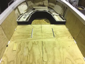 Then we started on the flooring. If replacing your floor, try to keep any old pieces to be used as templates, which will make cutting out a lot easier. Once all the pieces were shaped, it was time to start the flooring process. We decided not to carpet the deck again because it is hard to keep clean and holds moisture. So our first step was to resin coat both sides of the marine ply, then 400g/sq m fibreglass the top.