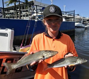 A few nice Whiting have been showing up in the Broadwater this week, junior fisho Bec (see photo in report) did well landing a quality feed fishing the edges of the sandbanks around the southern end of the Broadwater using live yabbies she pumped. Whiting seem to move around a bit at times, you will catch a few then they go quiet for a while. If you haven’t caught any fish for about half an hour just move around and try another spot close by and see how you go. I recommend 6lb fluro carbon leader, and either a 4 – 5 ball sinker to keep the bait in the bite zone, worms and yabbies are the best bait.