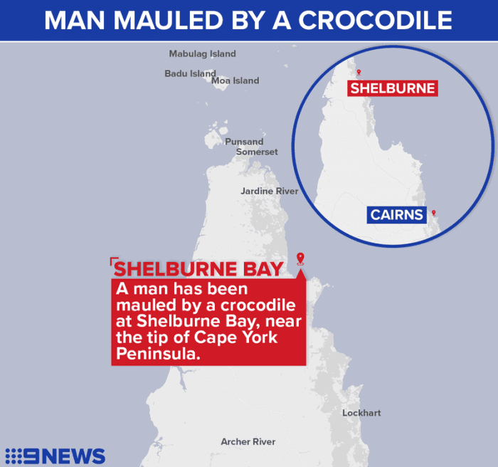 The man, in his 50s, was attacked by a crocodile in the Shelburne area near the tip of Cape York Peninsula while fishing about 5pm yesterday.