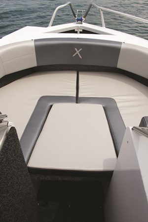 Moving to the bow by opening the latched swinging central door and windscreen section saw me coming upon the X Bowrider’s trump card: its versatile bow area. It’s a vast space in the 580 model (though fishing room out back is still decent) and can either be a delightfully comfortable and sumptuously padded lounge area, or with the cushions whipped away, a carpeted casting platform with central in-fill. How good is that!? So if you’re taking the family out for a day trip and a spot of tow sports, leave the cushions in and let everyone revel in the comfort of the sun lounge or leave the family at home and set the casting platform up for an ultra-stable perch from which to cast while fishing.
