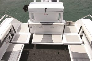 This is a huge aid for stability at rest and then once under way the chambers drain so you aren’t hampered by extra weight on the move. Despite looking something like a pleasure craft and featuring plenty of creature comforts, the X Bowrider won’t leave hard-core fishos feeling short-changed, with four rod holders on the hard top, four more on the bait board and another four recessed into the gunwales. However, if you’re purely a mad-keen fisho and never take family and friends out on the water, you probably wouldn’t be in the market for an X Bowrider.