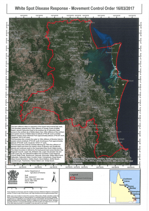 White spot disease and white spot syndrome virus, in this case, therefore present an immediate and serious risk to the aquaculture industry, commercial and recreational fishing industries as well as the environment. In this context, I consider it is necessary to take actions to restrict the movement of white spot syndrome virus (which is biosecurity matter under the Act) and its carriers by making a movement control order for a specified area that covers Moreton Bay, Pumicestone Passage, waterways flowing into Moreton Bay and south to the Queensland/New South Wales border, the 100 metres eastward of the ocean beaches on the Islands surrounding Moreton Bay and the Gold Coast to the Queensland/New South Wales border (see map attached). I consider it necessary to make this movement control order as I am satisfied, on reasonable grounds that white spot syndrome virus poses a biosecurity risk of enough seriousness, and the risk is high enough to justify the making of the order.